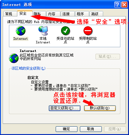 在彈出的對話框中將“安全”選項中設置還原為“默認級別”